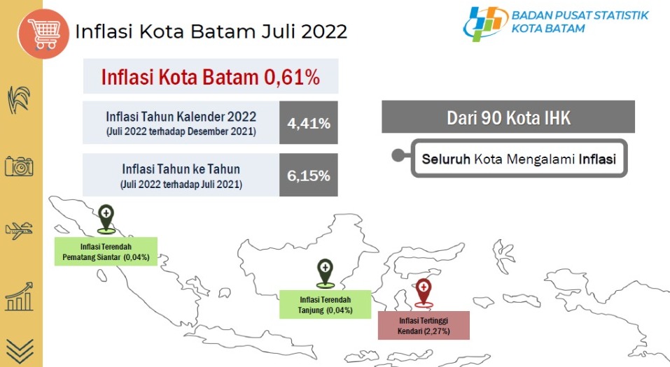 Inflasi Kota Batam ini, mengalami kenaikan dibanding periode yang sama tahun 2021 yakni 0,45 persen. Sementara itu inflasi tahun ke tahun (Juli 2021 terhadap Juli 2022) sebesar 6,15 persen.