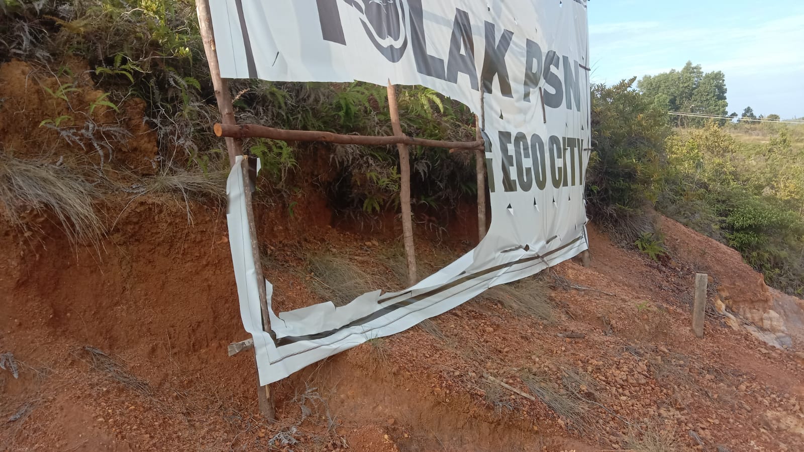 Spanduk berisi pesan penolakan PSN Rempang Eco City yang dipasang warga mengalami kerusakan-Edisi/ist.