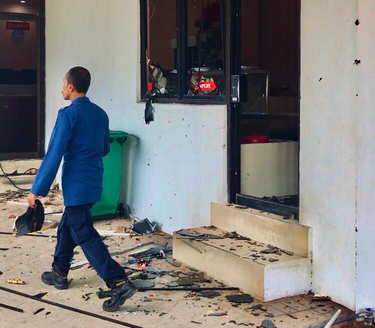 Serpihan kaca juga terlihat berserakan di lantai, tidak hanya di lantai 1, tetapi juga di lantai atas kantor BP Batam. Pagar kantor BP Batam juga jebol, dengan besi-besi bagian tengah pagar hilang.