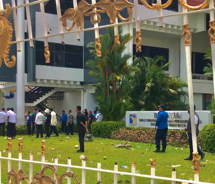 Massa melemparkan batu, botol air mineral, kayu serta besi ke arah petugas dan kantor BP Batam. Akibatnya, sejumlah kaca di gedung kantor BP Batam pecah berkeping-keping, bahkan beberapa batu yang dilemparkan oleh massa berhasil menembus lantai 1 kantor BP.