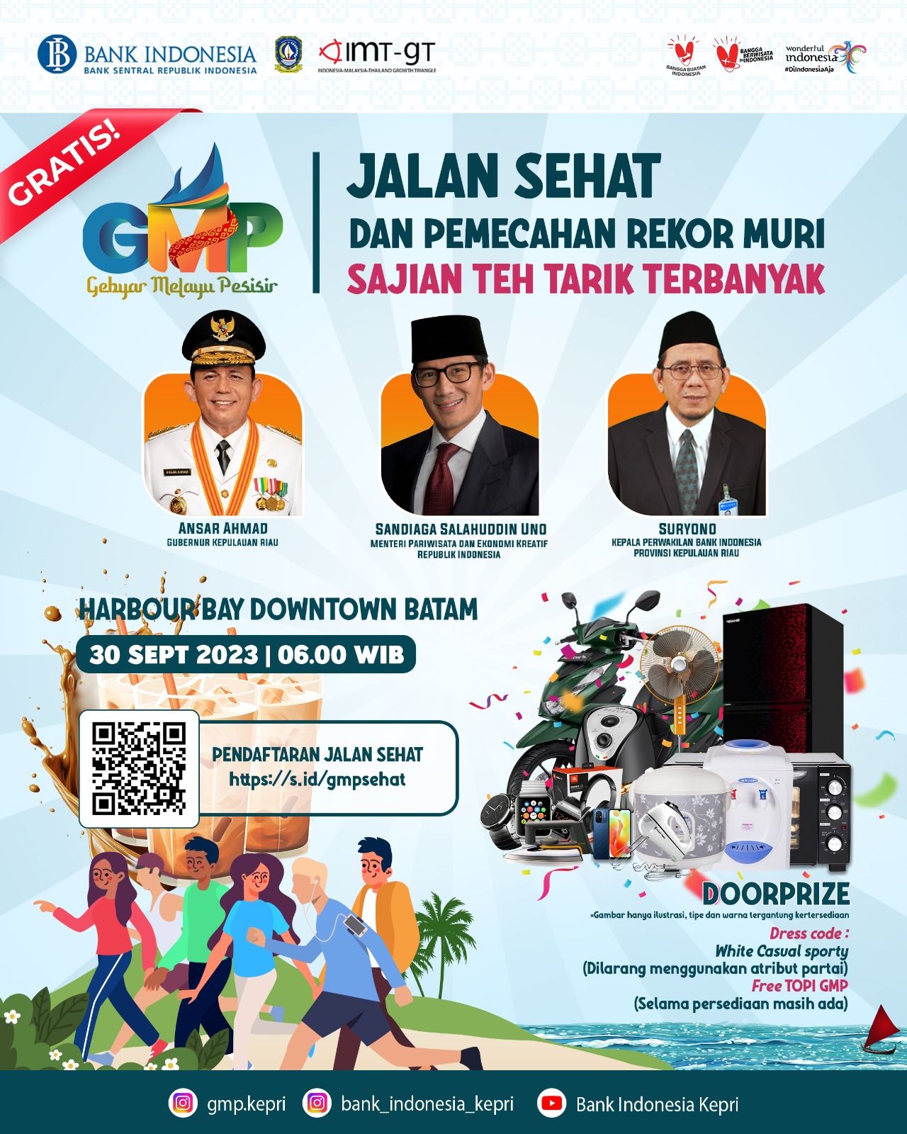 EDISI.CO, BATAM– Bank Indonesia (BI) Kepulauan Riau (Kepri) bersama Pemerintah Provinsi (Pemprov) Kepri akan menggelar Jalan Sehat dan Pemecahan Rekor Muri Sajian Teh Tarik Terbanyak di Harbour Bay Downtown Batam, Kecamatan Batu Ampar, Batam pada Sabtu (30/9/2023) mulai pukul 06.00 WIB.
