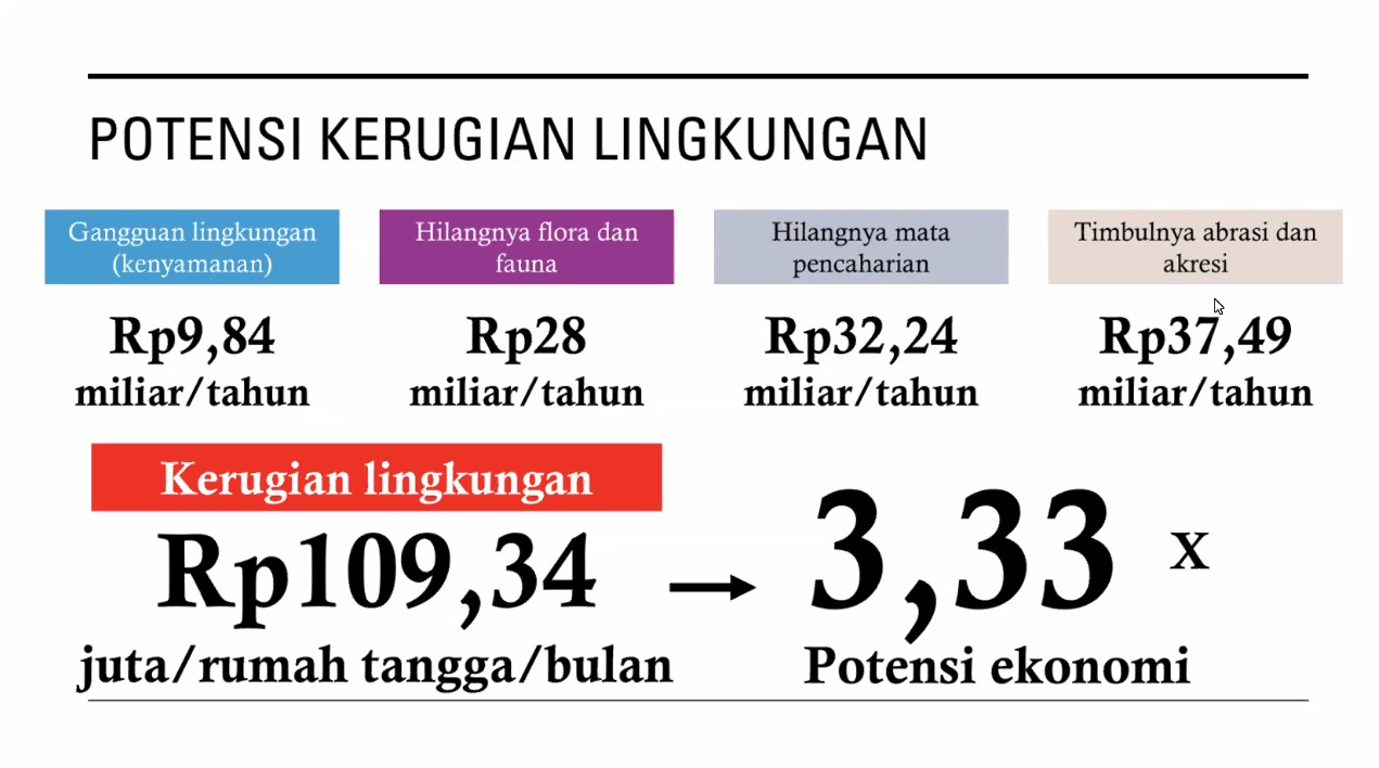 Dengan hasil valuasi ekonomi seperti tertera di atas, riset ini menegaskan bahwa biaya sosial-ekologis proyek jauh lebih besar dibanding manfaat ekonominya. Dengan kata lain proyek ini akan menyebabkan lebih banyak kerusakan dari sisi sosial dan lingkungan dibanding manfaat ekonomi yang dihadirkan.